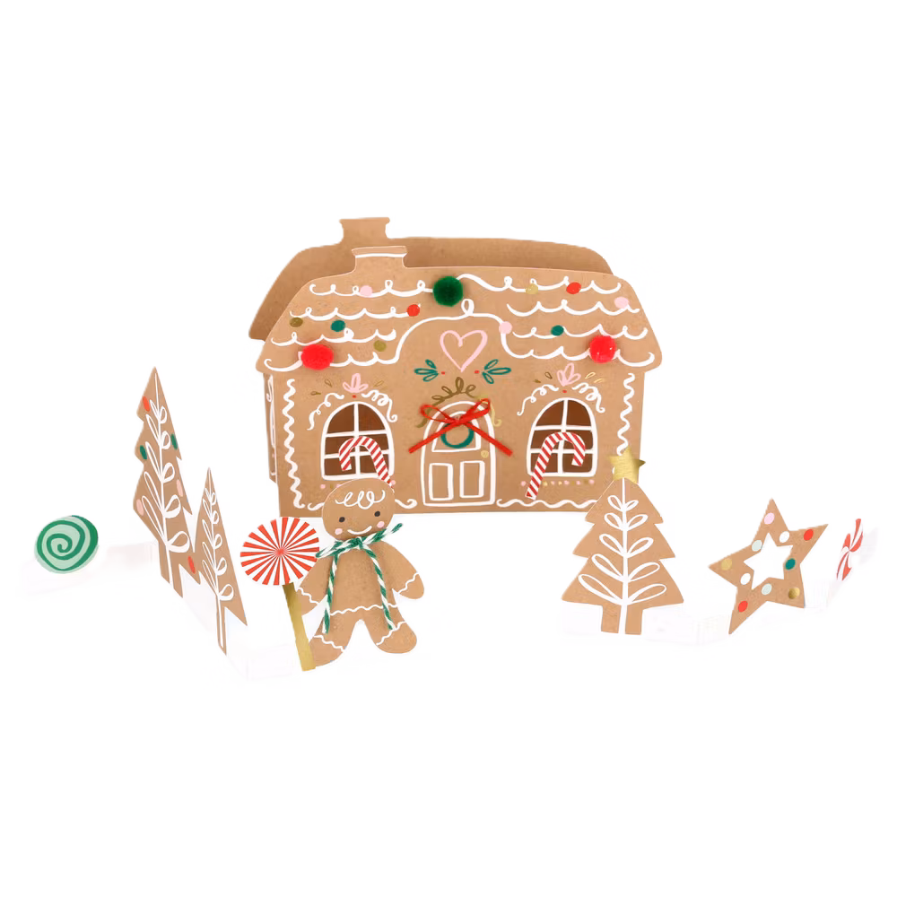 Överraska någon till jul med ett julkort som är mer än ett julkort, det är en hel julscen med ett pepparkakshus i centrum och med figurer som hör till. Text inuti: Seasons Greetings. Mått: 178 x 127 x 44mm.