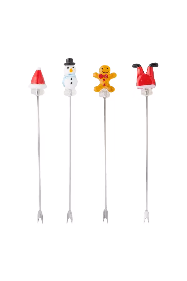 De perfekta coctailgafflarna för glöggminglet. Setet innehåller fyra gafflar med juliga dekorationer av glas på toppen. Tål ej diskmaskin och micro. Längd 12 cm.